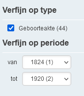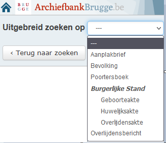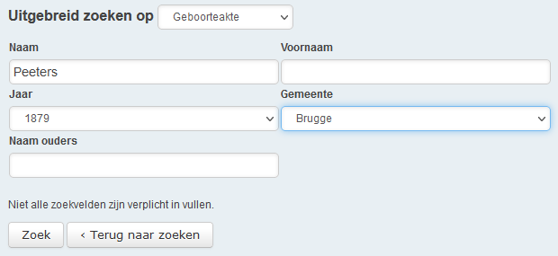 Met uitgebreid zoeken kunt u specifieker zoeken binnen een bepaalde bron. U kunt kiezen uit de burgerlijke stand (geboorte-, huwelijks- of overlijdensakten), bevolkingsregisters, schepenboeken, affiches of rouwadvertenties. Elke keuze heeft een apart zoekformulier met een aantal zoekvelden. U bent niet verplicht ze allemaal in te vullen. Zie het voorbeeld hieronder: