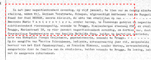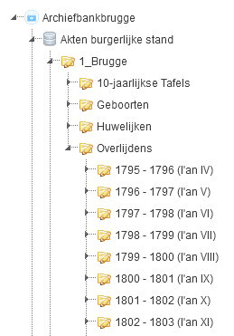 Voor verschillende bronnen zijn in de boomstructuur gescande indexen opgenomen: registers van de burgerlijke stand, bevolkingsregisters, Hallegeboden (historisch gezien officiële bekendmakingen van verordeningen), notulen van gemeenteraden en parochieregisters. Heeft u geen succes gehad met Vrij Zoeken of Uitgebreid Zoeken? Dan kunt u misschien via deze indexen de persoon of het onderwerp vinden waarnaar u op zoek bent. De indexen bevatten verwijzingen die u verder helpen navigeren door de boomstructuur. Voorbeeld: de overlijdensakte van Justus Slembrouck (Brugge, 1933), noteer het aktenummer (857) in de index. U kunt dit nummer gebruiken om de afbeelding in de boomstructuur op te zoeken: