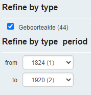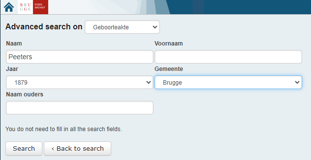 Advanced Search allows you to search more specifically within a certain source. You can choose between Civil Registers (birth, marriage or death certificates), population registers, burghers' books, posters or obituaries. Each choice has a separate search form with a number of search fields. You are not required to complete them all. See the example below: